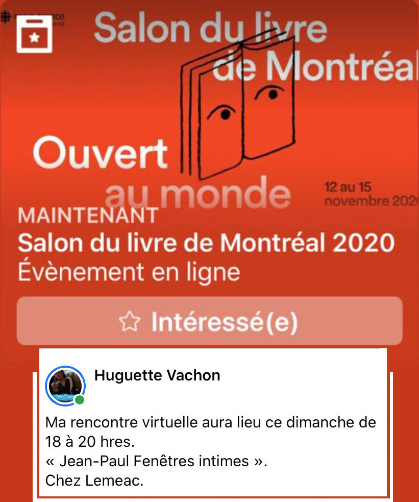 Huguette Vachon _ Jean-Paul Fenêtres intimes _ au salon du livre de Montréal et à Québec en 2021.