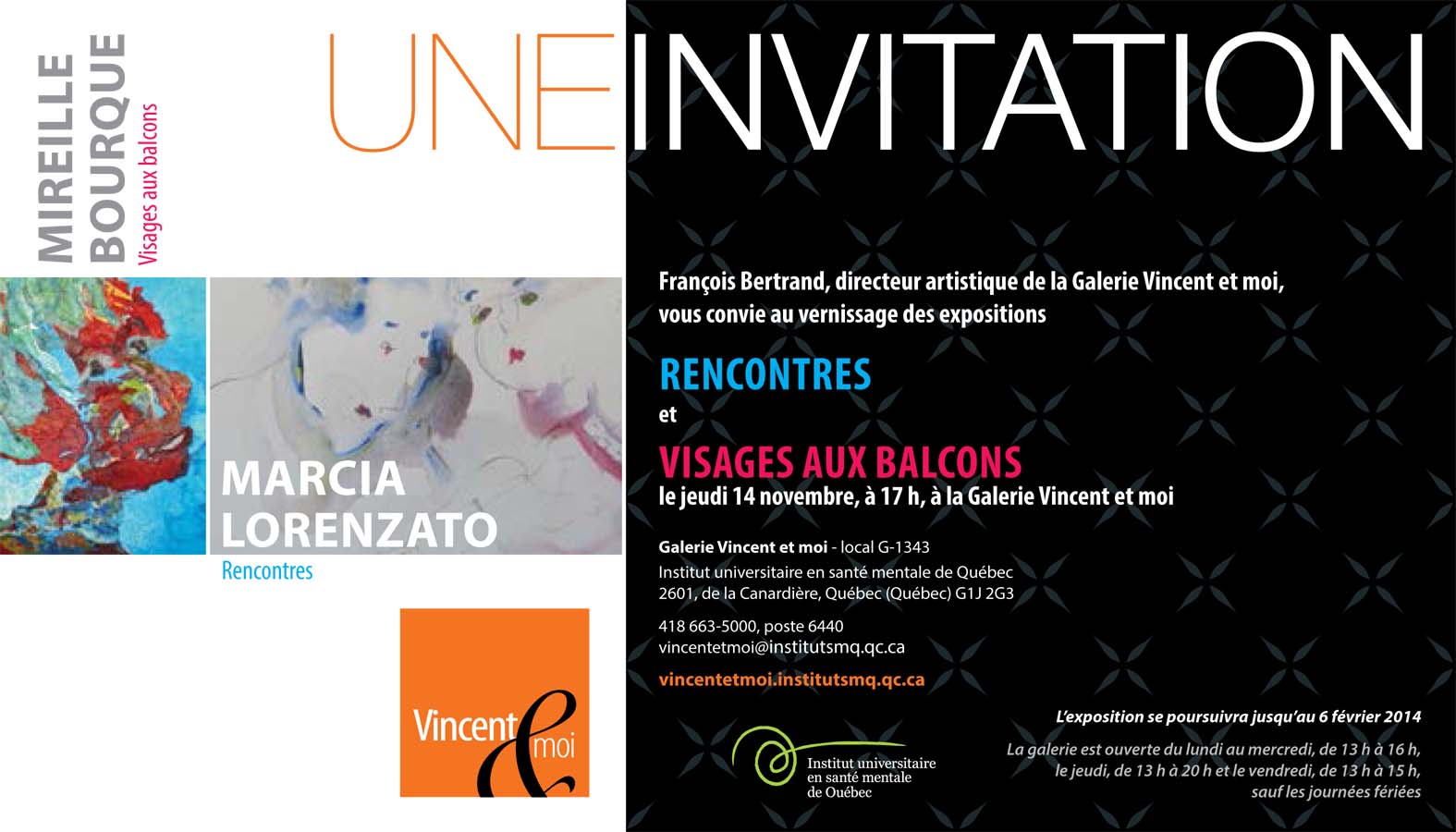 Vincent et Moi Par André Bécot © 7 novembre 2013 Vernissages Aucun commentaire Mireille Bourque ,Marcia Lorenzato (artistes) Jeudi 14 novembre,à 17h,à la Galerie Vincent et moi. Etiqueté le:Marc Bellemare,Marcia Lorenzato (artistes).studio Bécot,Mireille Bourque,Vincent et moi ← Michel Lessard Conférencier Réjeanne Lizotte → Laisser un commentaire Annuler la réponseVotre adresse e-mail ne sera pas publiée. Les champs obligatoires sont indiqués avec *Commentaire * Nom * E-mail * Site web Enregistrer mon nom, mon e-mail et mon site dans le navigateur pour mon prochain commentaire. Δ