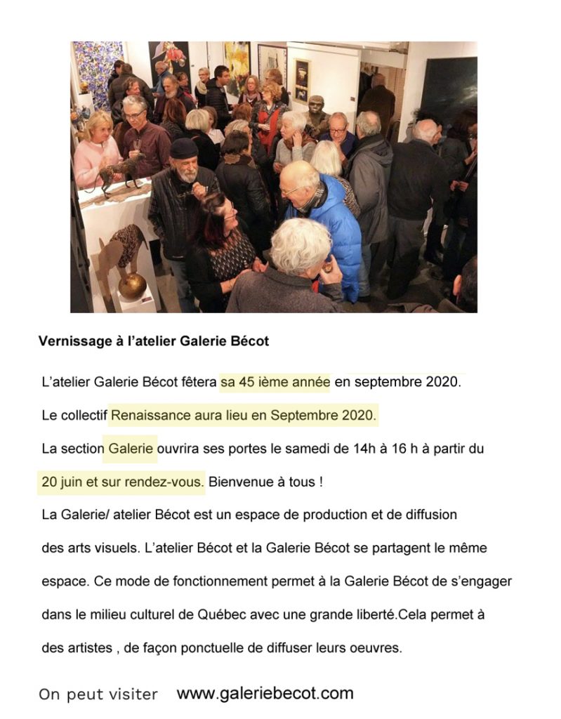 L’atelier Galerie Bécot fêtera sa 45ième année de fonctionnement en septembre 2020. La section galerie reprendra ses activités lorsque la COVID 19 sera sous contrôle. Par contre il est possible de visiter sur rendez-vous, Pour ce faire contactez le 418.559.6816.