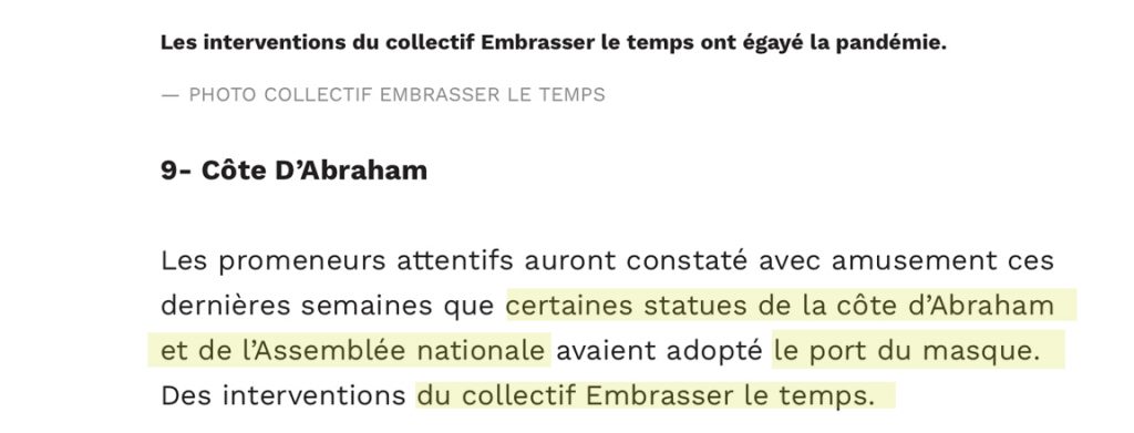 L’art s’immisce un peu partout au coeur de Québec……certaines statues de la côte d’Abraham et de l’Assemblée nationale …..collectif Embrasser le temps !
