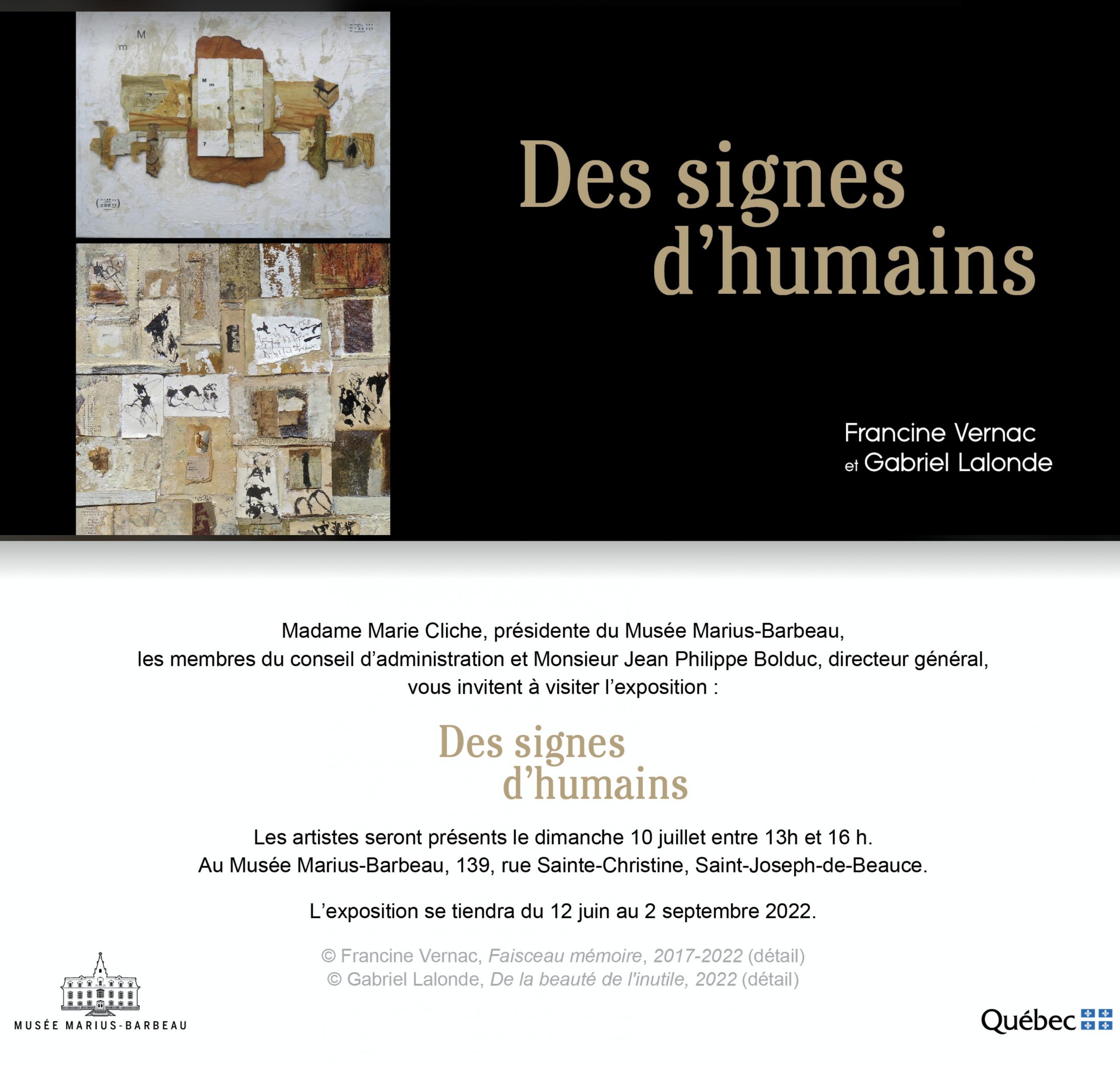 Madame Marie Cliche, les membres du conseil d’administration et Monsieur Jean Philippe Bolduc vous invitent à visiter l’exposition_ Des signes d’humains_ Bienvenue à tous !