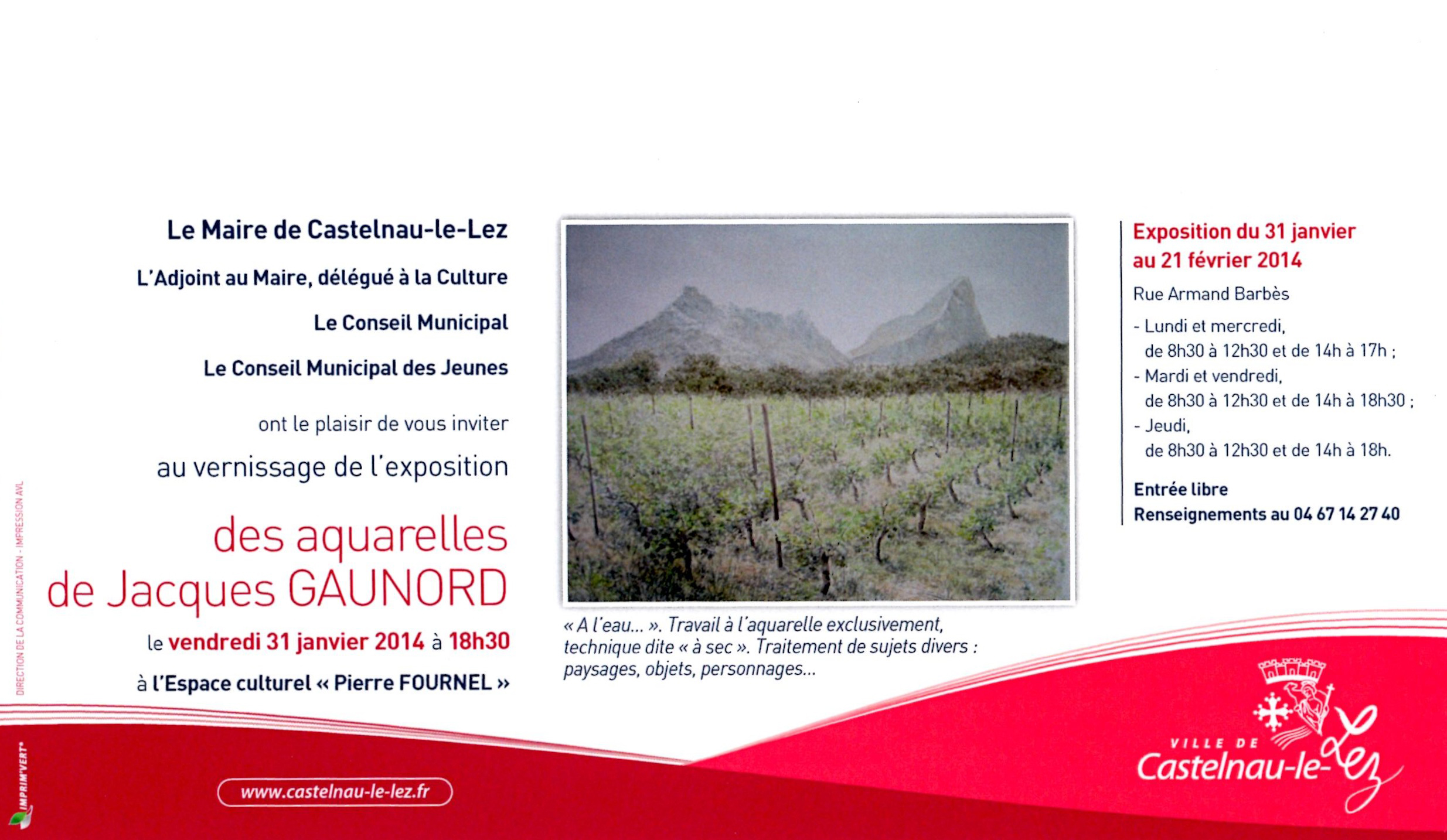 Plusieurs Artistes du Québec ont séjourné à la Maison d’Emma de Saint-Mathieu-de-Tréviers en France. Cette maison est administrée par l’association des Vendémiaires. Jacques Gaunord en a été président pendant de nombreuses années. Il présente une exposition de ses aquarelles à la Mairie de Castelnau-Le-Lez. Au nom de tous mes collègues peintres qui ont séjourné à l’ombre du Pic-St-Loup nous lui souhaitons un franc succès et le remercions pour tous ces années consacrées à la promotion de l’art et des échanges internationaux.