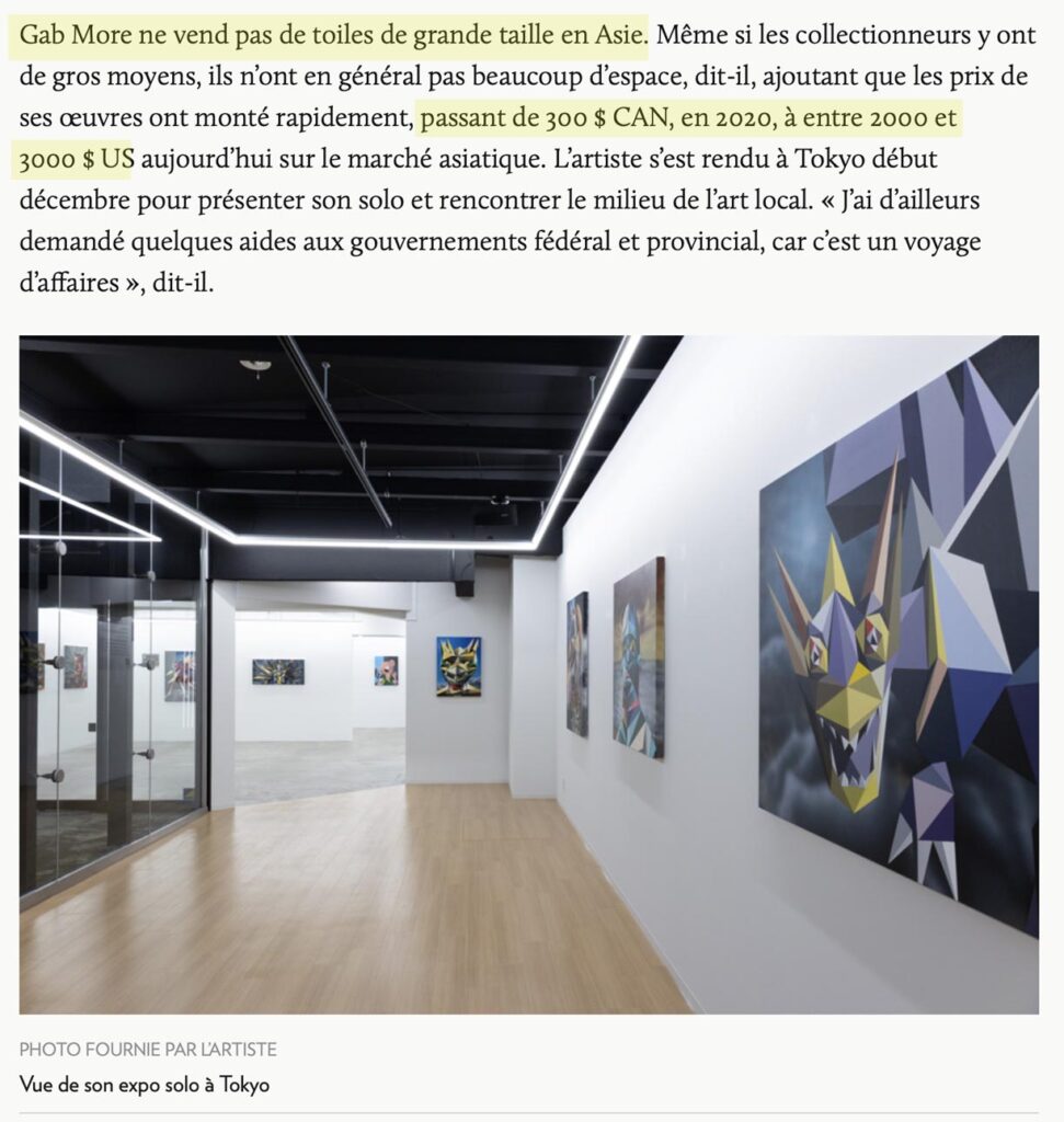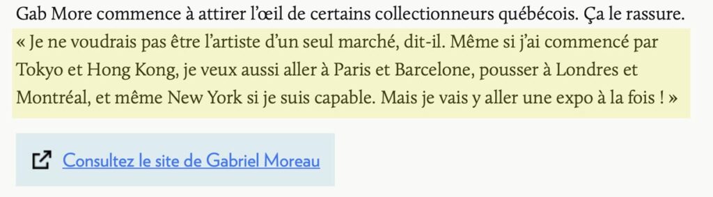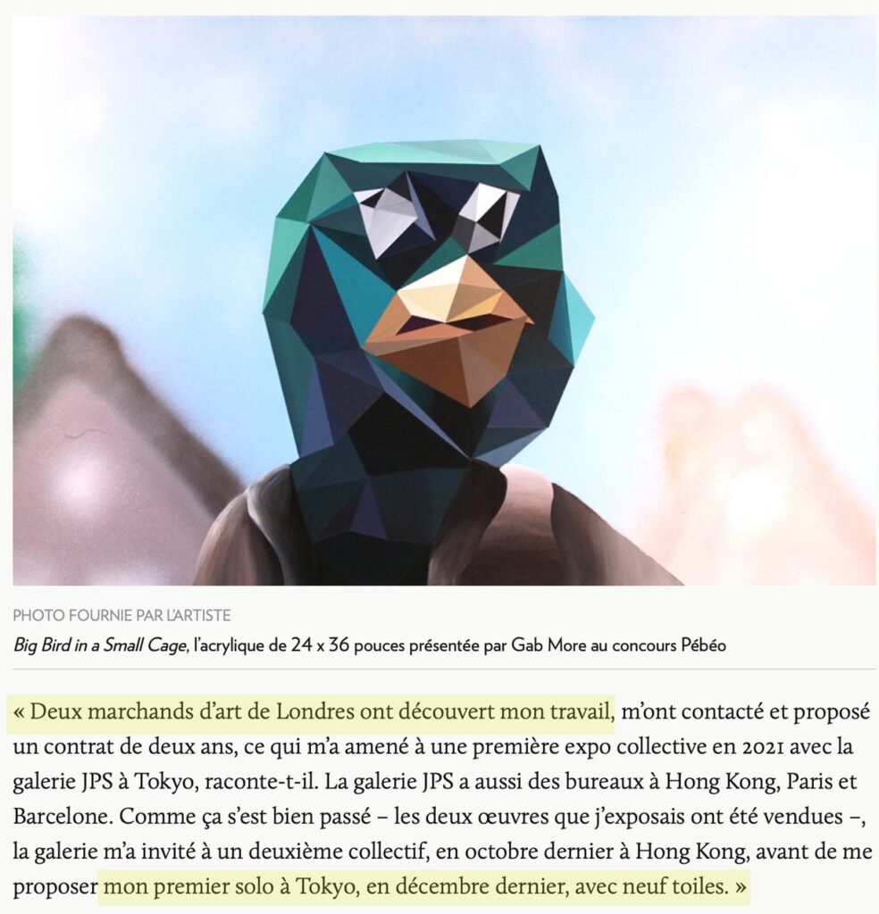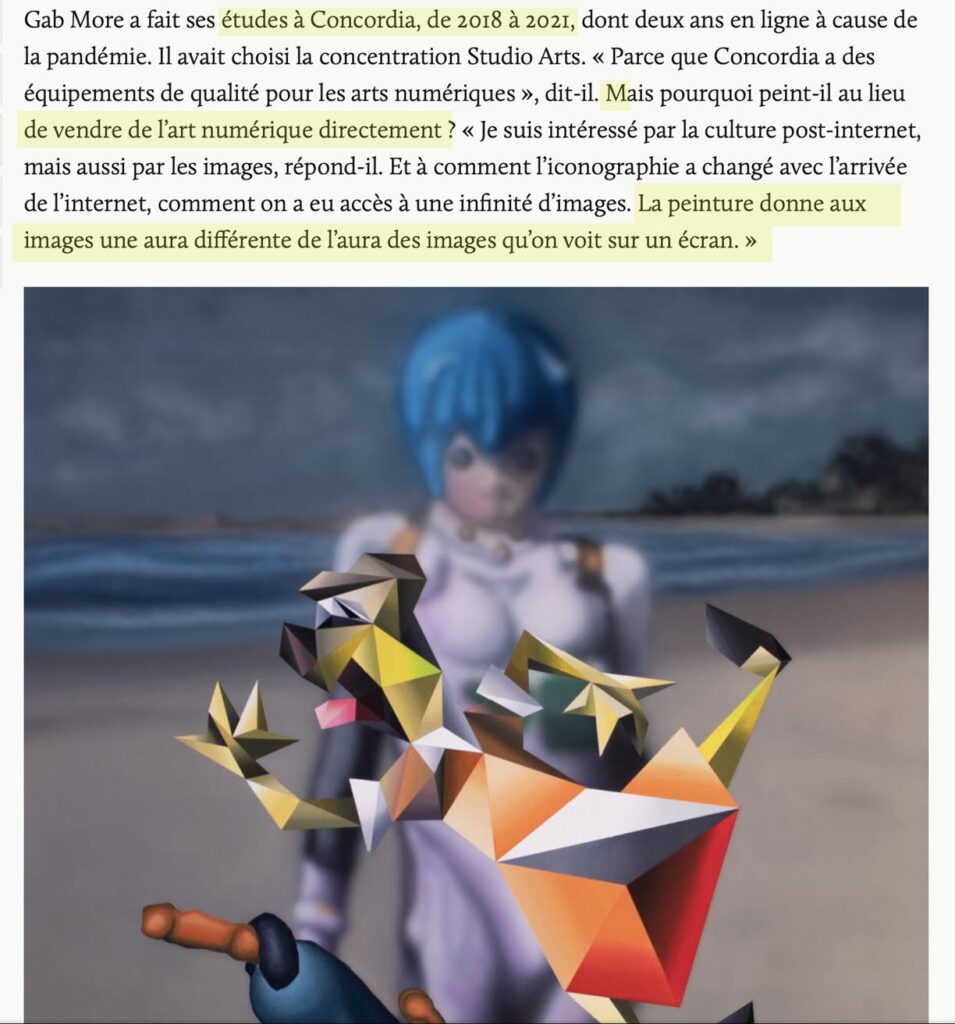 Gab More ne s’intéresse pas au marché des NFT. C’est le contraire de ce que je veux développer. Le concept de l’image numérique comme étant une reproduction que rien ne distingue et qui correspond surtout au médium qu’est le NFT plus qu’à l’image de l’oeuvre, ça ne m’intéresse pas. – Gabriel Moreau