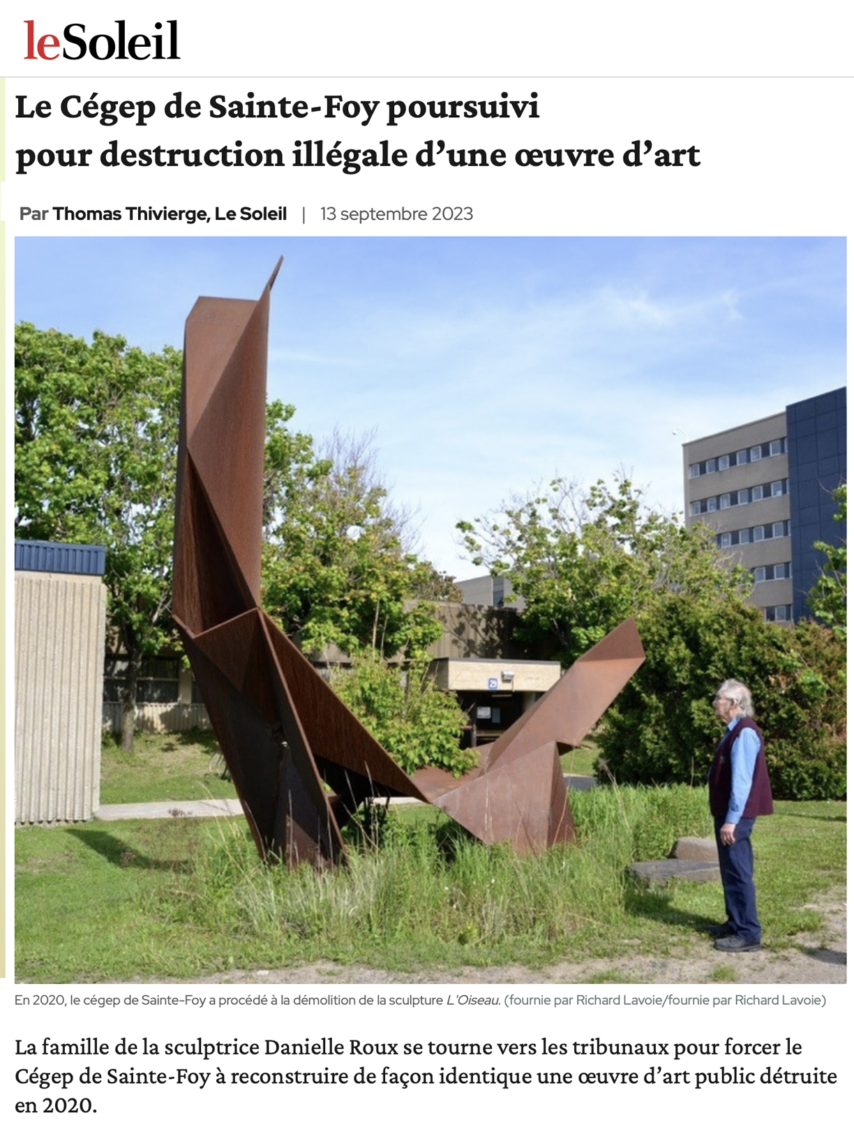 Le Cégep de Sainte-Foy ( Bienvenue en Arts Visuels = terrible paradoxe ) poursuivi pour destruction illégale d’une oeuvre d’art.