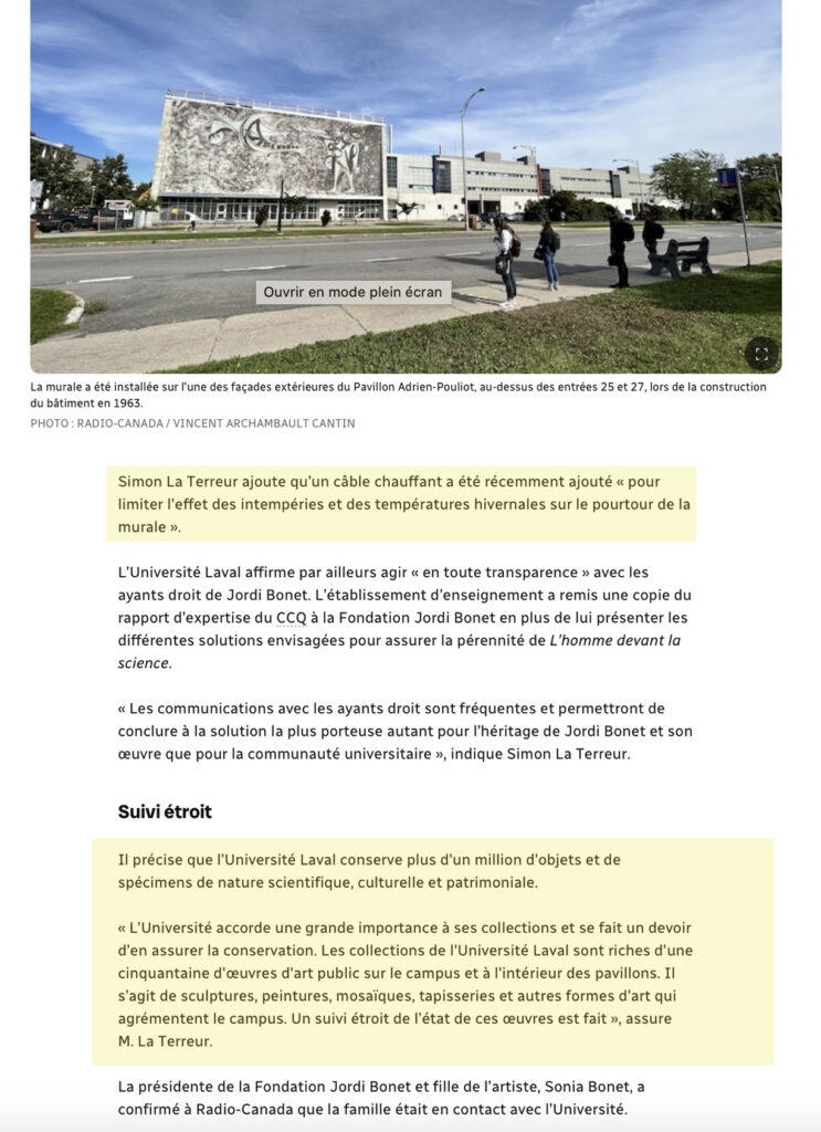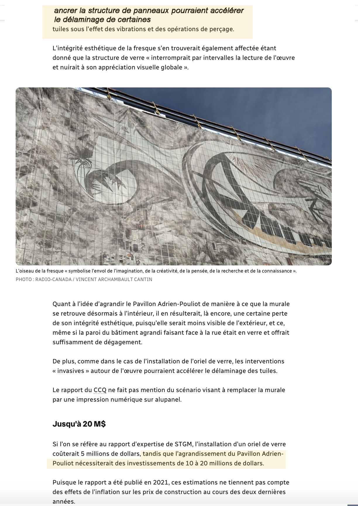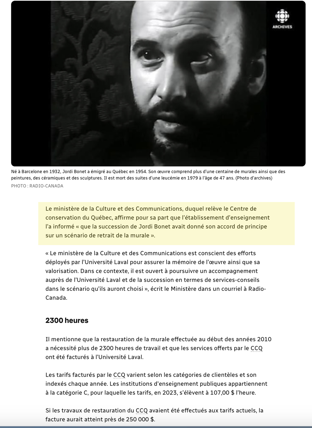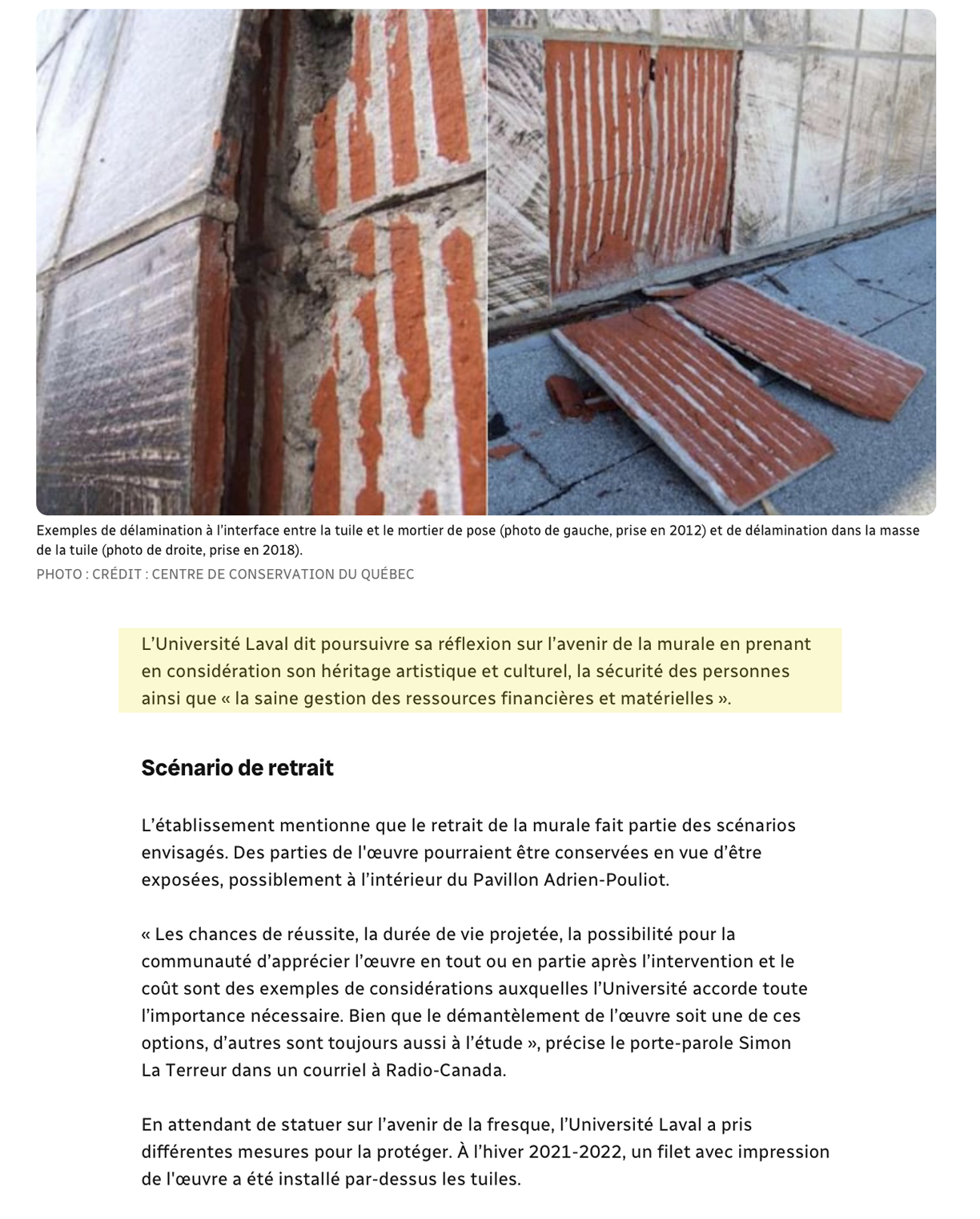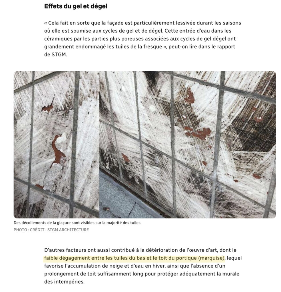 Une oeuvre d’art emblématique en péril à l’université Laval.Le problème au Québec, est l’entretien des oeuvres. Saviez -vous que le début de la construction de la cathédrale de Milan date de 1386, cinq siècles et demi ayant été nécessaires pour l’achever, en 1932. Par contre l’entretien est continuel depuis 1386.