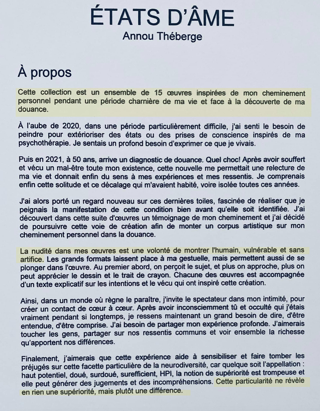 Elle a occasionnellement participé à quelques expositions collectives (dont Illumina chez Bécot été 2023 ) et deux solo. C’est son cheminement personnel qui inspirera sa dernière série d’œuvres très intimes avec le souhait d’aller vers l’autre, de partager et d’initier un dialogue sur la différence. « États d’âme », présentée jusqu’au 3 novembre, à la Galerie d’art TNT.Le vernissage est ce vendredi, le 6 octobre, en formule 5 à 7, en présence de l’artiste