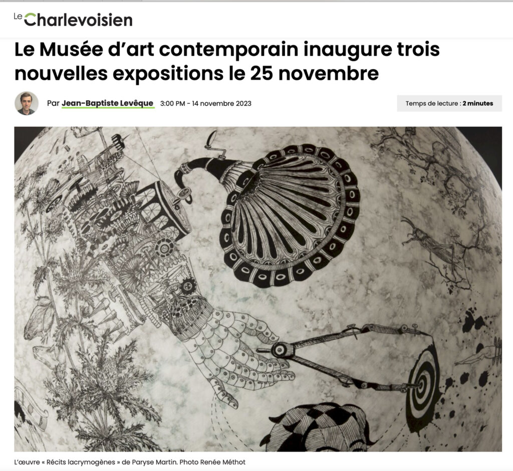 Le Musée d’art contemporain de Baie-Saint-Paul (MACBSP) présentera dès le 25 novembre trois nouvelles expositions : Paryse Martin – Regards Obliques, Le corps sublime de Jim Ritchie et L’art de se faire brasser, qui célèbre les 25 ans de la Microbrasserie Charlevoix.