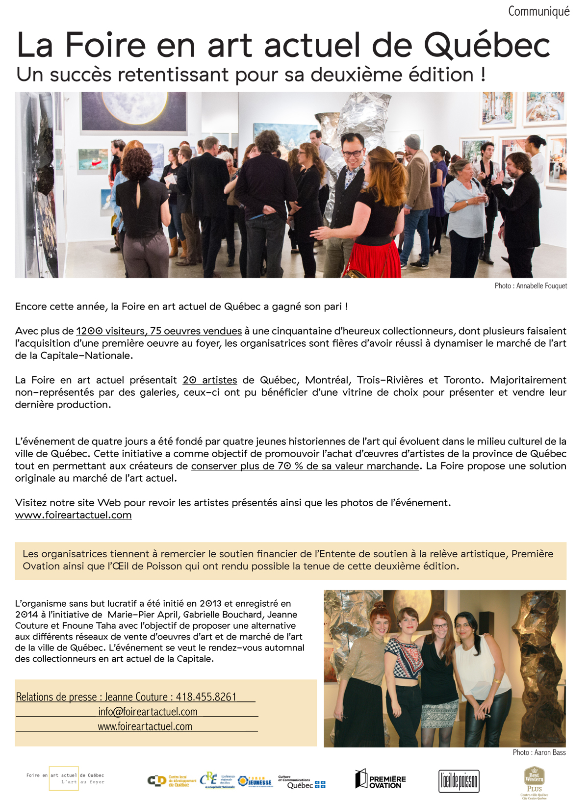 La Foire en art actuel de Québec, en plus de présenter le travail de vingt artistes du 16 au 19 octobre prochain, étend son champ d’action. Cette présence au Cercle est un autre pas pour soutenir les artistes non-représentés en galerie à l’année. Ce sera l’occasion pour ceux-ci d’exposer et de vendre de nouveau leur travail à Québec. Surveillez nos communications dans les prochains mois qui annonceront les artistes sélectionnés dans le cadre de ce nouveau partenariat.