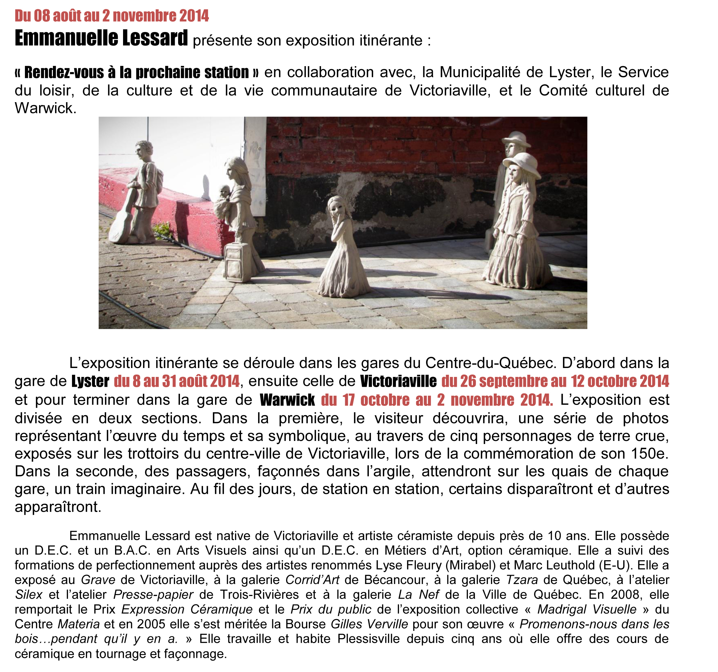Emmanuelle Lessard est native de Victoriaville et artiste céramiste depuis près de 10 ans. Elle possède un D.E.C. et un B.A.C. en Arts Visuels ainsi qu’un D.E.C. en Métiers d’Art, option céramique. Elle a suivi des formations de perfectionnement auprès des artistes renommés Lyse Fleury (Mirabel) et Marc Leuthold (E-U). Elle a exposé au Grave de Victoriaville, à la galerie Corrid’Art de Bécancour, à la galerie Tzara de Québec, à l’atelier Silex et l’atelier Presse-papier de Trois-Rivières et à la galerie La Nef de la Ville de Québec. En 2008, elle remportait le Prix Expression Céramique et le Prix du public de l’exposition collective « Madrigal Visuelle » du Centre Materia et en 2005 elle s’est méritée la Bourse Gilles Verville pour son oeuvre « Promenons-nous dans les bois…pendant qu’il y en a. » Elle travaille et habite Plessisville depuis cinq ans où elle offre des cours de céramique en tournage et façonnage.