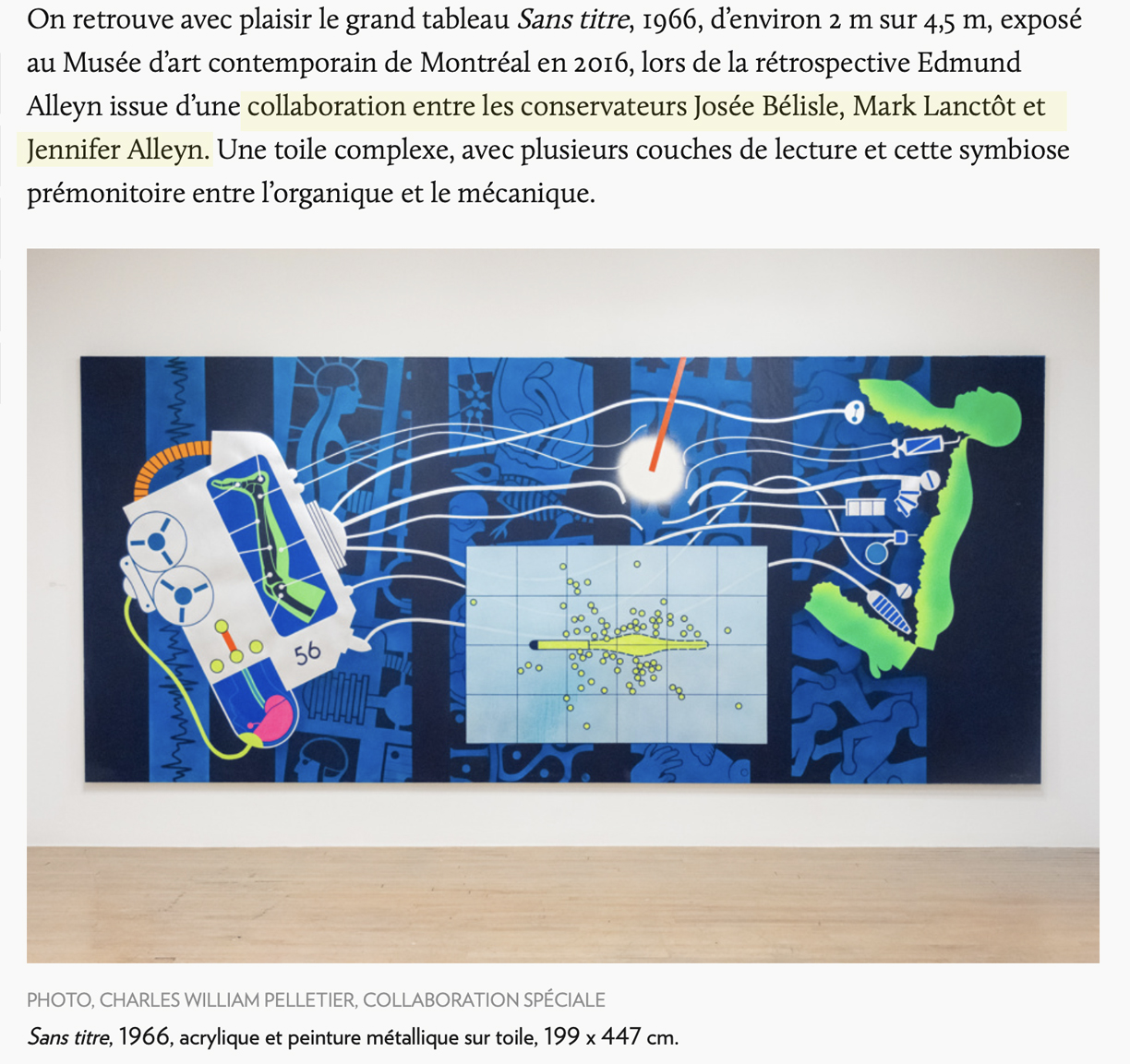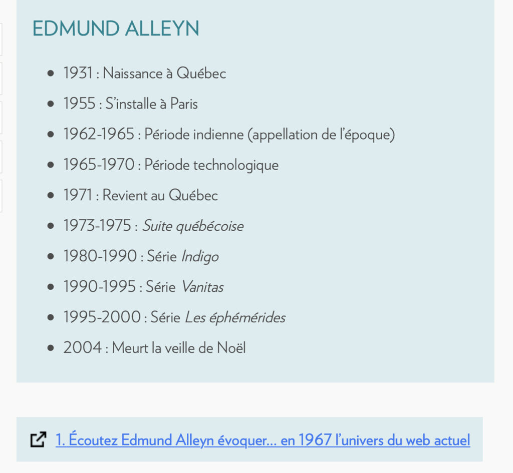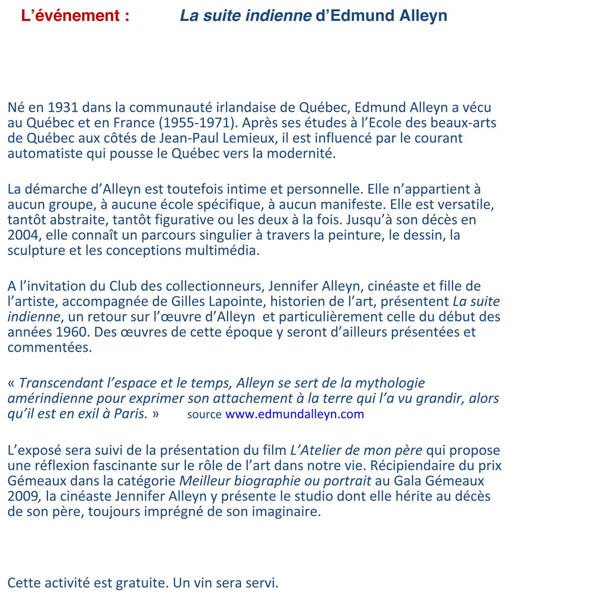 Né en 1931 dans la communauté irlandaise de Québec,Edmund Alleyn a vécu au Québec et en France(1955-1971).Après ses études à l’école des beaux-arts de Québec aux côtés de Jean-Paul Lemieux,il est influencé par le courant automatiste qui pousse le Québec vers la modernité.