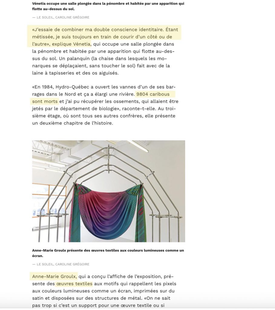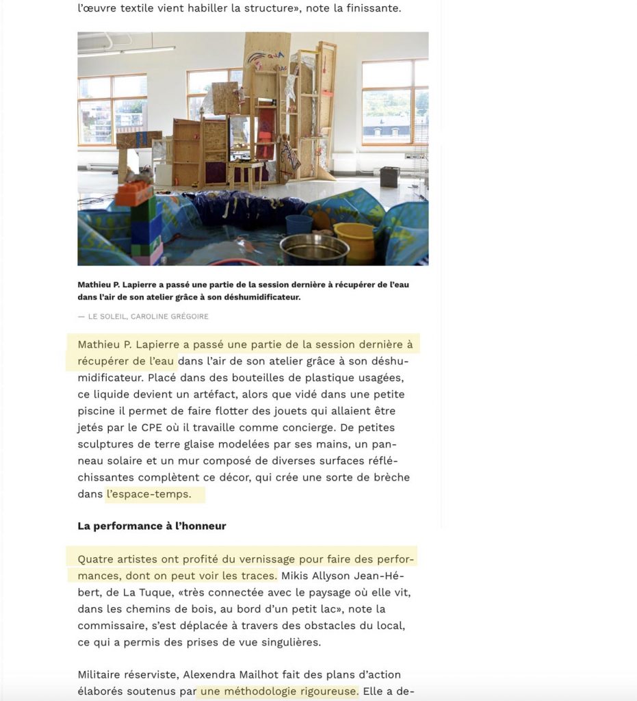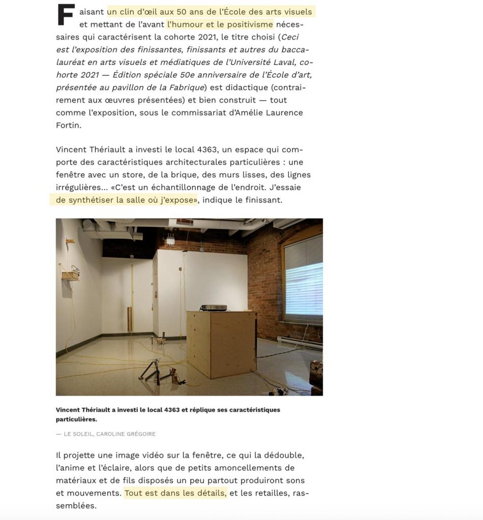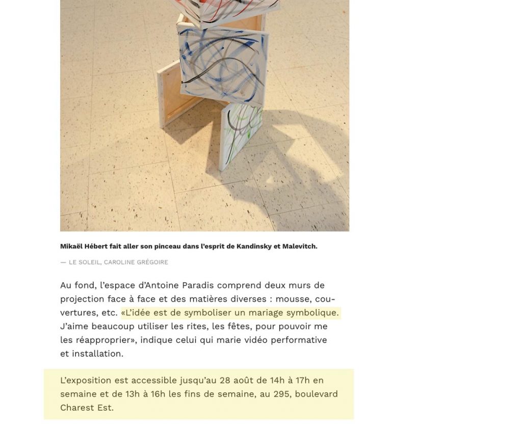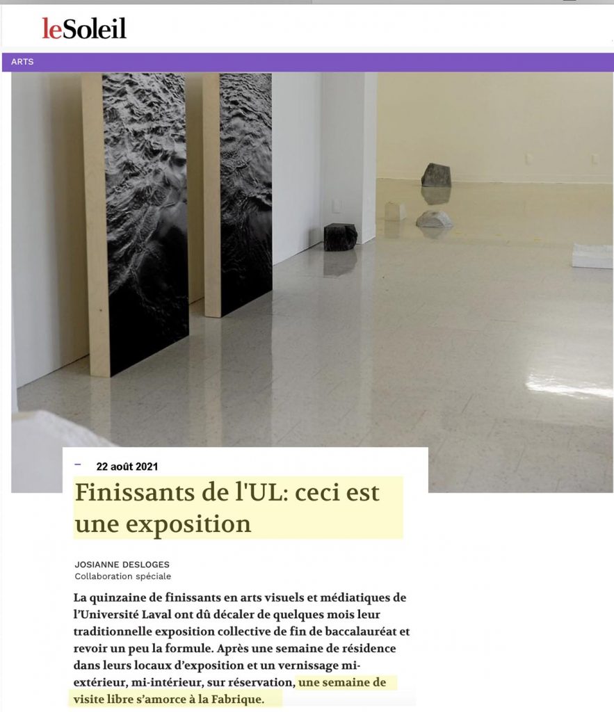 (Québec) L’exposition des finissants en arts visuels de l’Université Laval investit cette année des locaux du Réacteur, centrale créative, dans l’ancien Lépine-Cloutier. Des échantillons d’une trentaine de pratiques diversifiées et déjà bien affirmées ont été agencés par Patrick Dubé, du Lieu, qui agit comme commissaire cette année.