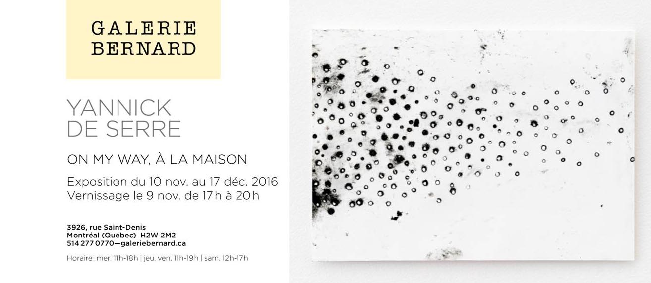 Le travail de Yannick De Serre a fait l’objet de nombreuses expositions solos et collectives. On a apprécié ses présentations individuelles: au Musée d’art contemporain de Baie-Saint-Paul et à la Maison amérindienne de Mont-Saint-Hilaire (2012), à la Maison des arts et de la culture de Brompton et à la Galerie Modulum (2013), à Aires Libres à Montréal (2014) ainsi qu’à Zocalo, Centre d’artistes en art imprimé de Longueuil (2015). Au cours des prochains mois on pourra voir ses plus récentes créations à la Bibliothèque de Varennes, au Musée Bruck de Cowansville et également dans une exposition collective au centre CIRCA art actuel à Montréal. Ses œuvres ont été présentées à la foire internationale Art Basel en Suisse et à la foire Papier de Montréal. Yannick De Serre a participé à diverses résidences d’artistes et est bénéficiaire de plusieurs bourses. Ses œuvres font partie de prestigieuses collections privées et institutionnelles. Il est représenté par la Galerie Bernard depuis 2015.