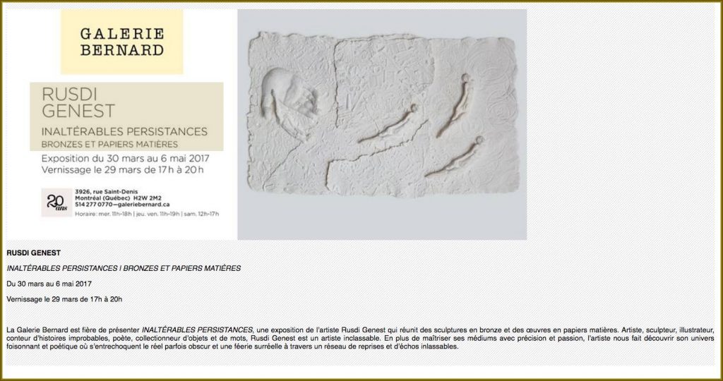 Rusdi Genest est né à Sherbrooke, en 1939. Ancien élève de l’École des beaux-arts de Montréal, Rusdi Genest a poursuivi sa formation artistique aux États-Unis et en France. Il réside en Californie, de 1964 à 1970, et il se spécialise en sculpture à l’Université de Californie de Long Beach. Plus tard, il enseigne la sculpture et participe à des ateliers de créativité, danse et théâtre. En France, il fréquente les ateliers de l’École des beaux-arts de Paris et de l’École des métiers d’art. Il œuvre auprès des sculpteurs César, Martin, Couturier et Volpi. De retour au Canada, Genest obtient une maîtrise en arts plastiques à l’UQÀM, en 1981. Pendant plusieurs années, il enseigne la sculpture à l’Université du Québec à Chicoutimi et ensuite à l’École des beaux-arts Saidye Bronfman, à Montréal. Rusdi Genest, est récipiendaire de prix : de la Californie à Paris, à Ravenne, à Toronto. Il est membre de l’Académie royale des arts du Canada. Il a réalisé des monuments d’intégration à l’architecture et obtenu des subventions gouvernementales. Ses œuvres ont été exposées internationalement et peuvent être trouvées dans des collections muséales et publiques à travers le monde, entre autre : aux Archives nationales et à la Bibliothèque nationale du Canada.
