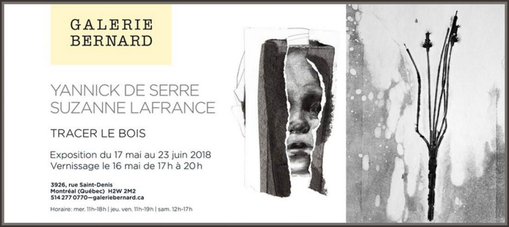 La Galerie Bernard est fière de vous présenter, du 16 mai au 23 juin 2018, l’exposition TRACER LE BOIS des artistes Yannick De Serre et Suzanne Lafrance, artiste invitée. L’exposition nous fait découvrir deux pratiques distinctes sur papier, l’une abstraite, l’autre figurative. Réunies dans une réflexion sur la signification et les impacts de l’événement circonstanciel sur notre corps et notre pensée, leurs œuvres inédites suggèrent une exploration intime des fondements de l’expérience humaine.