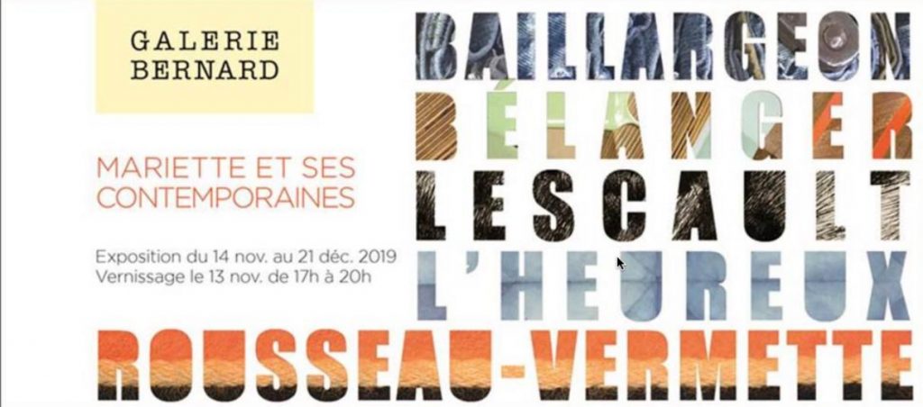La Galerie Bernard est heureuse de présenter, du 13 novembre au 21 décembre 2019, l’exposition MARIETTE ET SES CONTEMPORAINES. Ce collectif réunit les artistes Carole Baillargeon, Marie-Fauve Bélanger, Charlie Lescault et Stéphanie L’Heureux autour de la grande pionnière des arts textiles au Québec, Mariette Rousseau-Vermette (1926-2006).