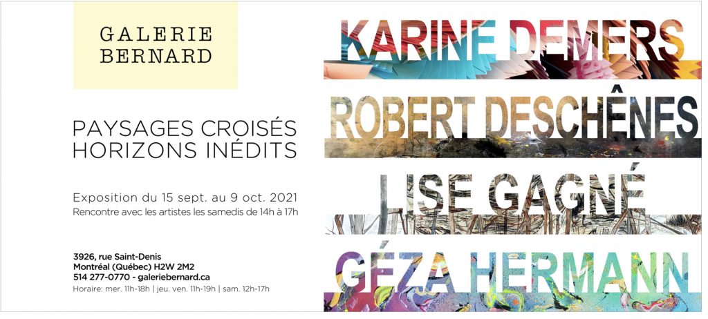 La Galerie Bernard est heureuse de vous annoncer l’exposition collective PAYSAGES CROISÉS / HORIZONS INÉDITS des artistes Karine Demers, Robert Deschênes, Lise Gagné et Géza Hermann, présentée du 15 septembre au 9 octobre 2021.