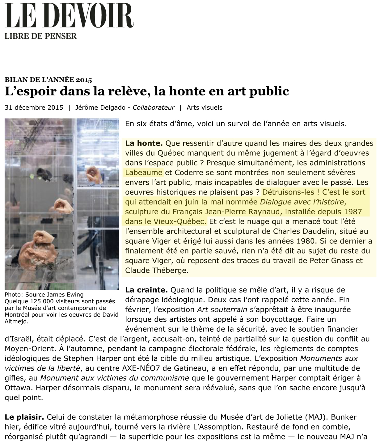 La honte: Que ressentir d’autre quand les maires des deux grandes villes du Québec manquent du même jugement à l’égard d’oeuvres dans l’espace public ? Presque simultanément,