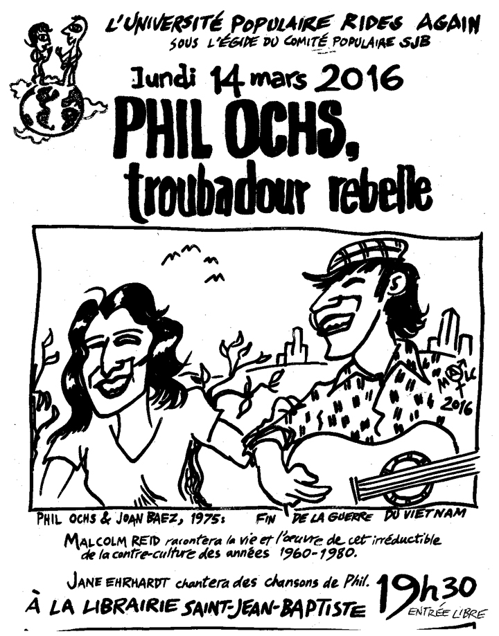 Phil Ochs,troubadour rebelle par Malcolm Reid Par André Bécot © 13 mars 2016 Artistes Aucun commentaire Etiqueté le:André Bécot,Jane Ehrhardt,Joan Baez,Malcolm Reid,Phil Ochs,Réjeanne Reid ← Les marchands d’Hitler Présentation de Quais-Blues, en présence du réalisateur Richard Lavoie (exposition en cours 2√4) Bécot,Sylvain,Lachance → Laisser un commentaire Annuler la réponseVotre adresse e-mail ne sera pas publiée. Les champs obligatoires sont indiqués avec *Commentaire * Nom * E-mail * Site web Enregistrer mon nom, mon e-mail et mon site dans le navigateur pour mon prochain commentaire. Δ