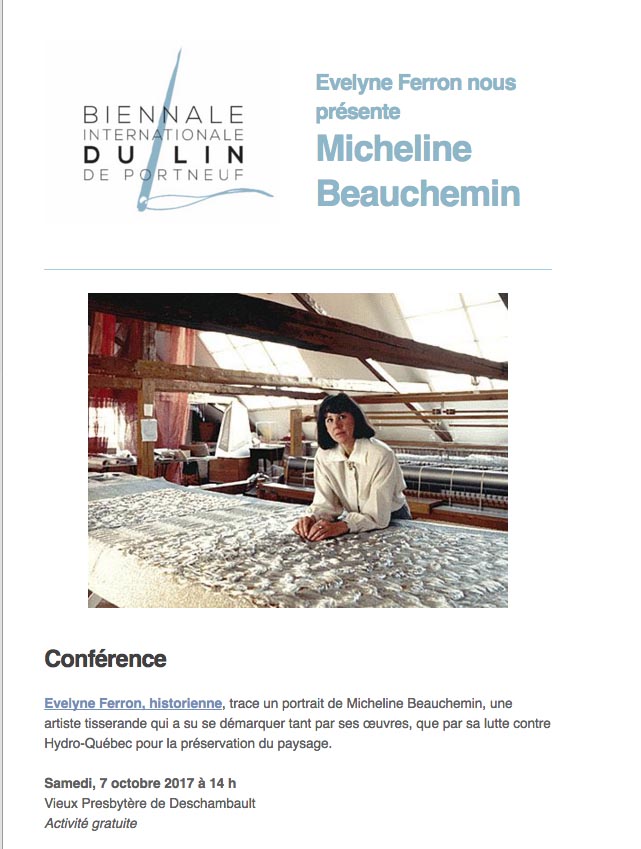 Conférence: Evelyne Ferron, historienne,trace un portrait de Micheline Beauchemin, une artiste tisserande qui a su se démarquer tant par ses oeuvres, que par sa lutte contre Hydro-Québec pour la préservation du paysage.