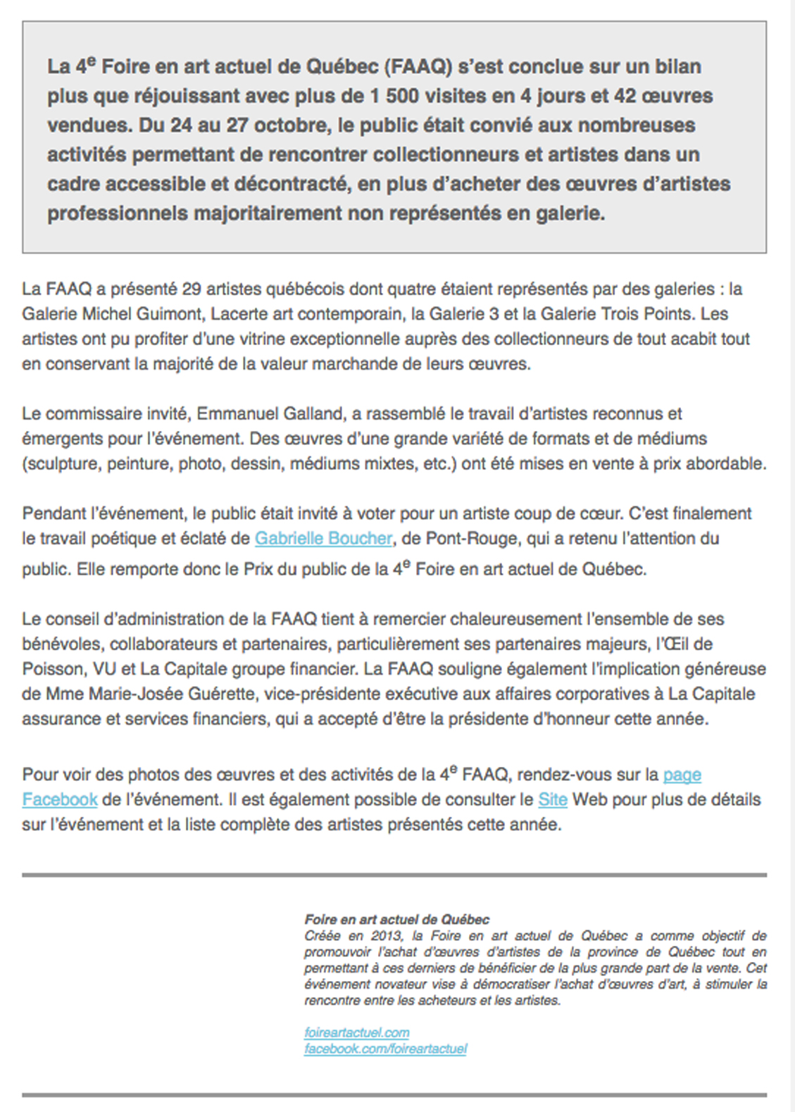 Voyez pour tous les détails : Site de la Foire en Art Actuel de Québec (www.foireartactuel.com)