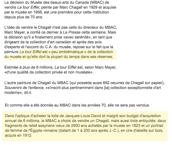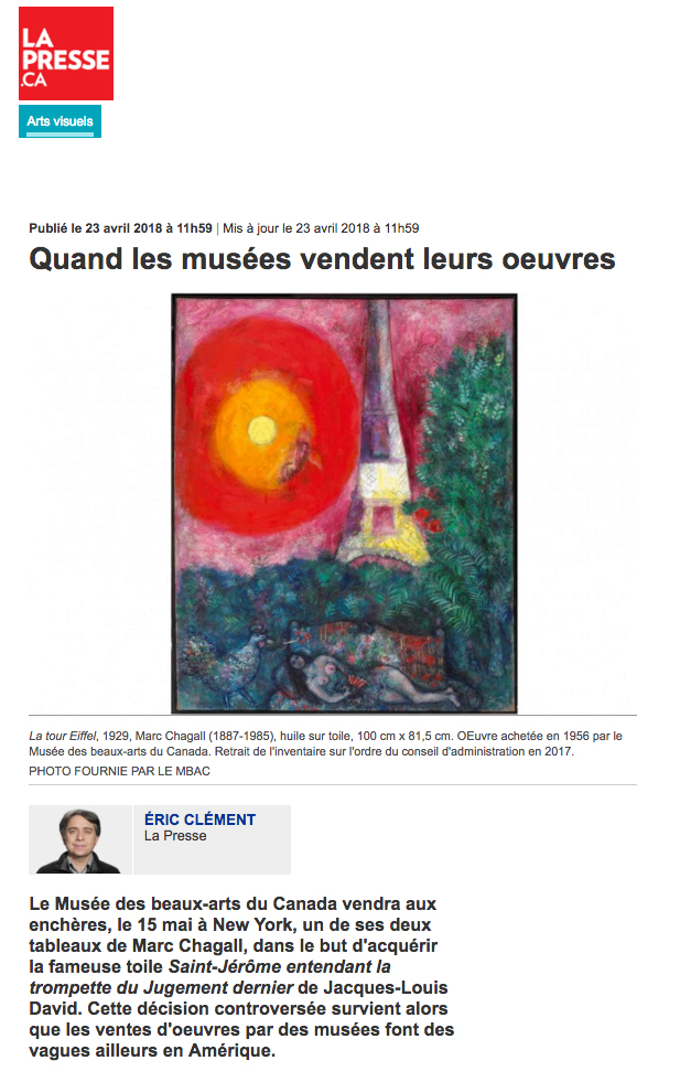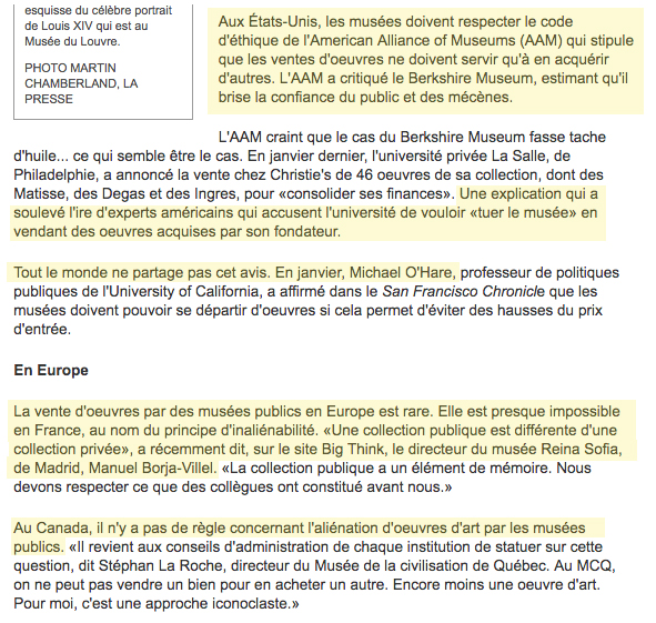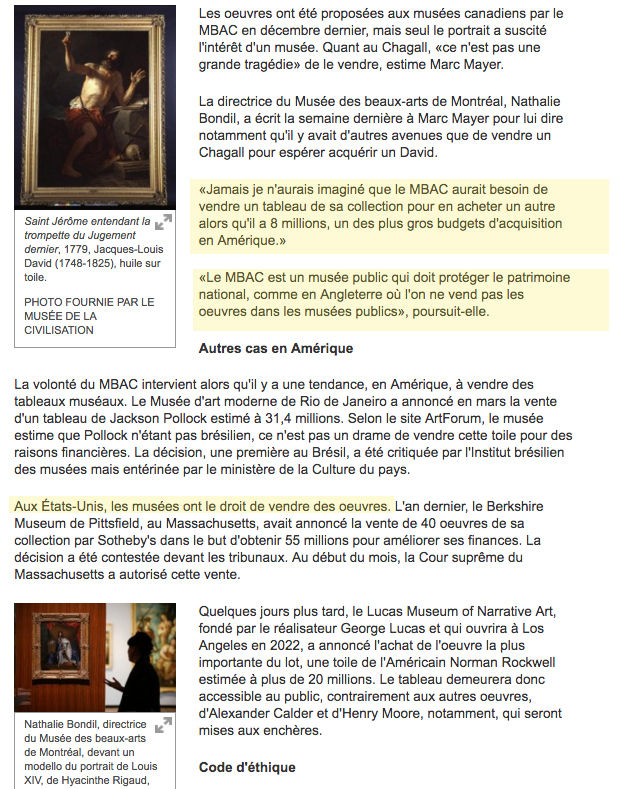 Au Canada, il n’y a pas de règle concernant l’aliénation d’oeuvres d’art par les musées publics.