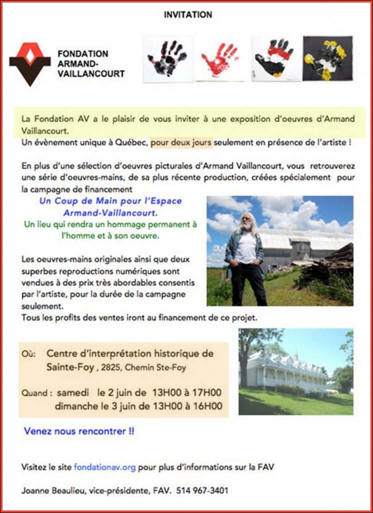 La Fondation AV a le plaisir de vous inviter à une exposition d’oeuvres d’Armand Vaillancourt. Un évènement unique à Québec, pour deux jours seulement en présence de l’artiste, au centre d’interprétation historique de Sainte-Foy, 2825, Chemin Ste-Foy, le samedi 2 juin de 13h00 à 17h00 ainsi que le dimanche le 3 juin de 13h00 à 16h00. Bienvenue à tous. !