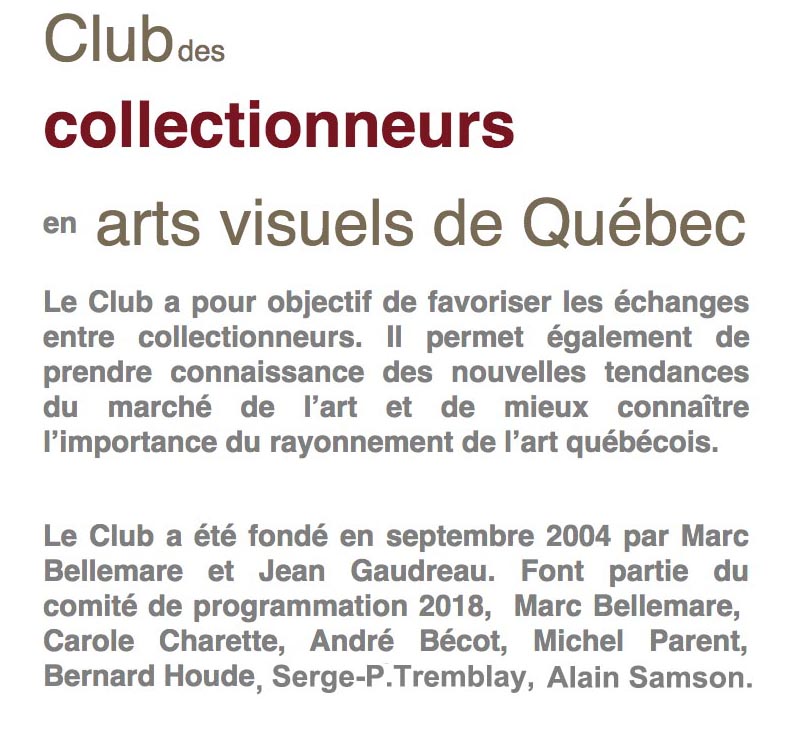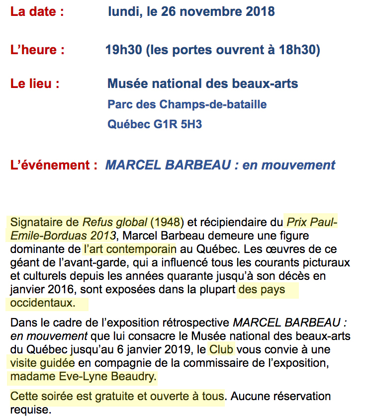 Lundi le 26 novembre 2018, le club des collectionneurs en arts visuels de Québec, vous convie à une visite guidée en compagnie de la commissaire de l’exposition de Marcel Barbeau, Madame Eve-Lyne Beaudry.