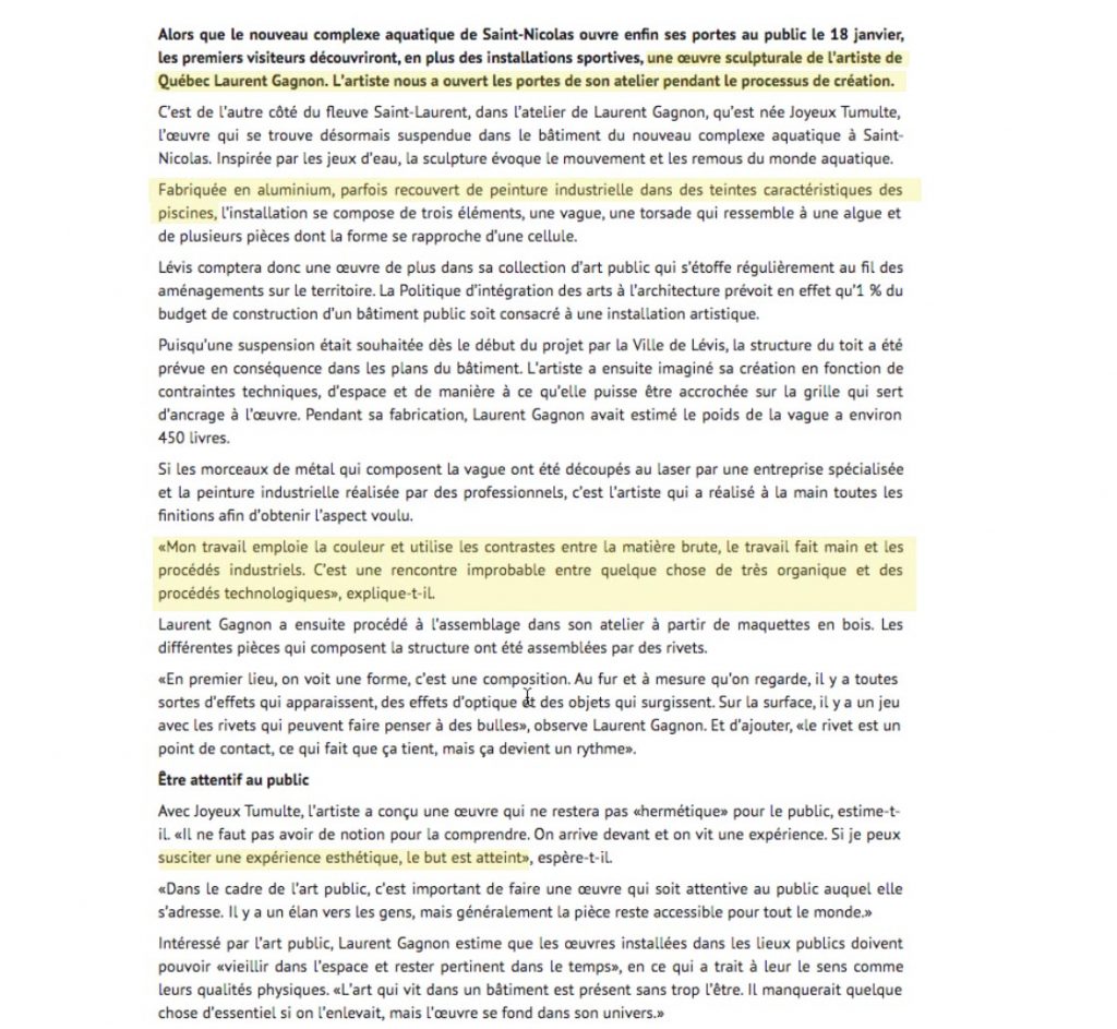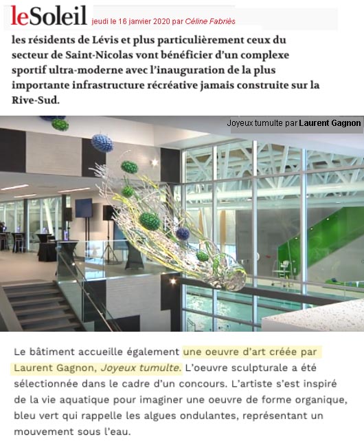 L’inauguration d’ une oeuvre d’art créée par Laurent Gagnon ( Joyeux tumulte) au complexe sportif ultra moderne de Lévis.